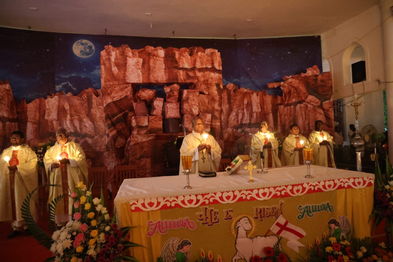 தஞ்சாவூர்: தஞ்சாவூர் திரு இருதய பேராலயத்தில் ஈஸ்டர் பெருவிழா வழிபாடு நேற்று நள்ளிரவு நடைபெற்றது.