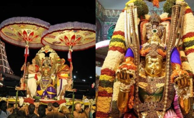 பக்தர்கள் அவற்றைப் பெற்றுக்கொண்டனர். இந்த அலங்காரப் பொருட்களுக்கு சிறப்பு பூஜைகள் செய்யப்பட்டன. அதன் பிறகு, அவை மடத்தின் வீதிகள் வழியாக ஊர்வலமாக எடுத்துச் செல்லப்பட்டு கோவிலில் பிரதிஷ்டை செய்யப்பட்டன. இன்றிரவு நடைபெறும் கருட சேவையின் போது இந்த அலங்காரப் பொருட்கள் மற்றும் கிளிகள் பக்தர்களால் அணிவிக்கப்படும் என்று நம்பப்படுகிறது. இதன் பொருள் வழக்கமான பௌர்ணமி கருட சேவை நடைபெறாது.
