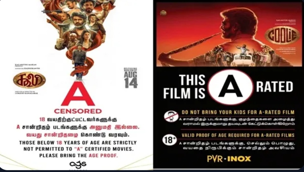 ரஜினிகாந்த் நடிப்பில் லோகேஷ் கனகராஜ் இயக்கியுள்ள “கூலி” திரைப்படம் எதிர்பார்ப்புகள் நிறைந்த படமாக இருக்கிறது. ஆகஸ்ட் 14ஆம் தேதி வெளிவர இருக்கும் இப்படத்திற்கு சென்சார் வாரியம் A சான்றிதழ் வழங்கியுள்ளது. இதனால், பிவிஆர் மற்றும் ஏஜிஎஸ் தியேட்டர்கள் 18 வயதுக்கு கீழானவர்கள் இப்படத்தை பார்க்க அனுமதிக்க மாட்டோம் என அறிவித்து, இந்த அறிவிப்பை போஸ்டராகவும் வெளியிட்டுள்ளன.