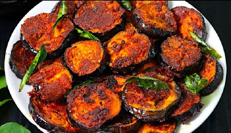 அடுப்பில் தோசைக்கல்லை வைத்து எண்ணெயை ஊற்றவும். தோசை கல் சூடானதும் அடுப்பை மிதமான தீயில் வைத்து கத்தரிக்காய் துண்டுகளை பொடித்து வைத்த மசாலாவில் பிரட்டி தோசை கல்லில் போட்டு சுற்றிலும் எண்ணெய் விட்டு 2 பக்கமும் திருப்பி போட்டு வேக வைக்கவும். இருபுறமும் பொன்னிறமானதும் எடுத்து சூடாக பரிமாறவும். இது சாம்பார் ரசத்திற்கு ஏற்ற சைட் டிஷ்.