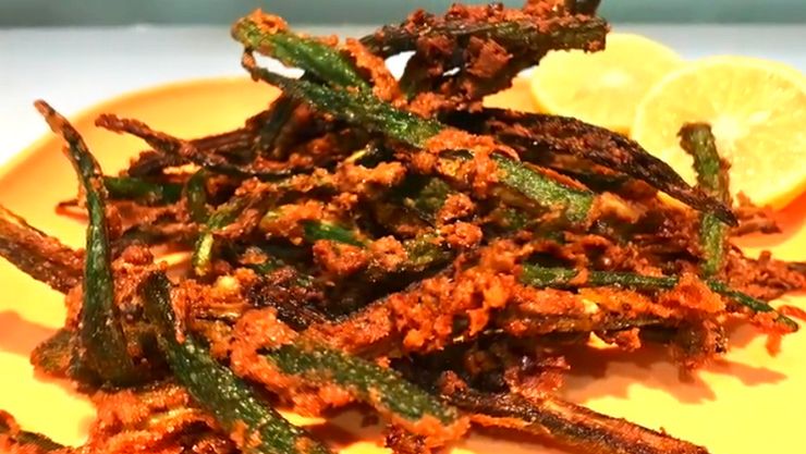 வெண்டைக்காய்- 250 கிராம்உப்பு- 1 1/2 தேக்கரண்டிமிளகாய்த் தூள்- 1 தேக்கரண்டிமஞ்சள் தூள்- 1/2 தேக்கரண்டிகரம் மசாலா- 1/2 தேக்கரண்டிசீரகப் பொடி- 1/2 தேக்கரண்டிசாட் மசாலா- 1 தேக்கரண்டிகடலை மாவு- 3 மேசைக்கரண்டிசோள மாவு- 1 மேசைக்கரண்டிஎண்ணெய்- பொரிப்பதற்குத் தேவையான அளவுஎலுமிச்சை- 1