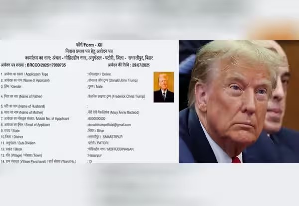 பீஹாரின் சமஸ்திபுர் மாவட்டத்தில் உள்ள மொஹியுதீன்நகர் மண்டலத்தில் ஜூலை 29-ஆம் தேதி இந்த விண்ணப்பம் ஆன்லைனில் தாக்கல் செய்யப்பட்டது. விண்ணப்பத்தில் டிரம்ப் புகைப்படம், முகவரி, ஆதார் எண், பார்கோடு போன்ற தகவல்கள் இடம் பெற்றிருந்தன.