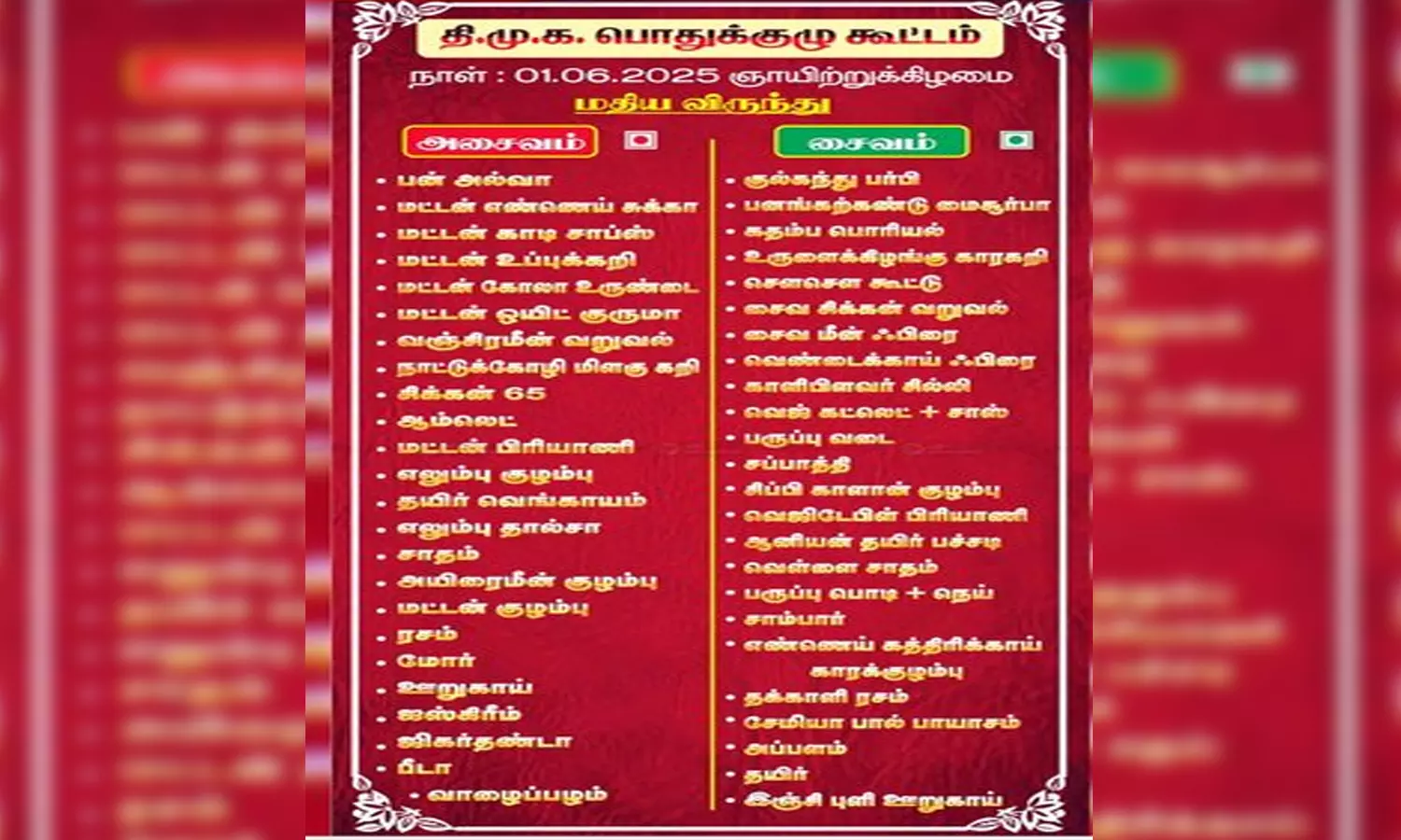 அதன்படி, பொதுக்குழுவில் பங்கேற்கும் திமுக உறுப்பினர்களுக்கு சைவ, அசைவ உணவுகள் மதிய விருந்துக்கு வழங்கப்படுகிறது.