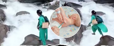 இமாச்சலப் பிரதேசத்தில் குழந்தைக்கு தடுப்பூசி போட ஆற்றைக் கடக்கும் செவிலியர்