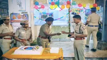 தஞ்சாவூரில் காவல்துறையினர் கேக் வெட்டி கொண்டாட்டம்