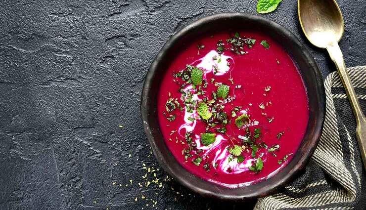 அடுப்பில் கடாயை அரைத்த விழுது, உப்பு, தண்ணீர் தேவைக்கேற்ப சேர்த்து நன்றாக கொதித்து வந்ததும் அடுப்பிலிருந்து இறக்கி கிரீம் புதினா சேர்த்து பருகவும். இப்போது பீட்ரூட் சூப் தயார்