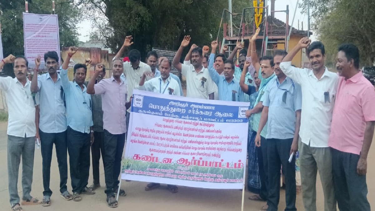 தஞ்சாவூர்: சென்னை உயர் நீதிமன்ற தீர்ப்பின் படி பொதுத் தொகுப்பு ஊதிய முறையில் ஊதியம் வழங்க வேண்டும் என்ற கோரிக்கையை வலியுறுத்தி தஞ்சாவூர் மாவட்டம் குருங்குளம் அறிஞர் அண்ணா சர்க்கரை ஆலை முன்பு அனைத்து தொழிற்சங்கங்கள் கூட்டு நடவடிக்கை குழு சார்பில் ஆர்ப்பாட்டம் நடந்தது.