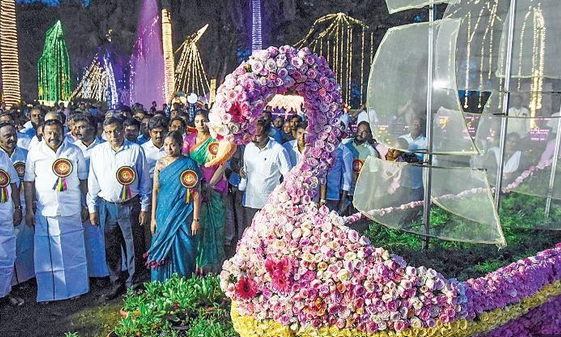 மேலும், பல்வேறு வகையான பழங்கள், காய்கறிகள் மற்றும் மசாலாப் பொருட்களால் சிற்பங்கள் அமைக்கப்பட்டுள்ளன. அண்ணா பூங்கா வளாகம் முழுவதும் வண்ண விளக்குகளால் ஒளிரும். இதேபோல், அரசு தாவரவியல் பூங்காவில் 5,600 ரோஜாக்களுடன் தேனீ உருவம், இரட்டை இதயம், செல்ஃபி பாயிண்ட், இறக்கைகள் கொண்ட இதயம் போன்றவை அமைக்கப்பட்டுள்ளன. மேலும், ஏரி பூங்கா உட்பட பல்வேறு இடங்களில் வண்ண மலர்களால் செல்ஃபி பாயிண்டுகள் அமைக்கப்பட்டுள்ளன.