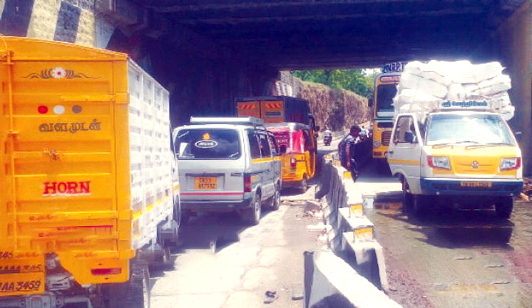 இதனால், காளைமாடு சிலை ரவுண்டானாவிலும் போக்குவரத்து கடுமையாக பாதிக்கப்பட்டது. எனவே, ரயில்வே நுழைவு பாலத்தில் உள்ள மழைநீர் வடிகால் மீது கம்பியாலான மூடி வைக்க வேண்டும் என்றும் அதனை முறையாக பராமரிக்க வேண்டும் என்றும் வாகன ஓட்டிகள் கோரிக்கை விடுத்தனர்.