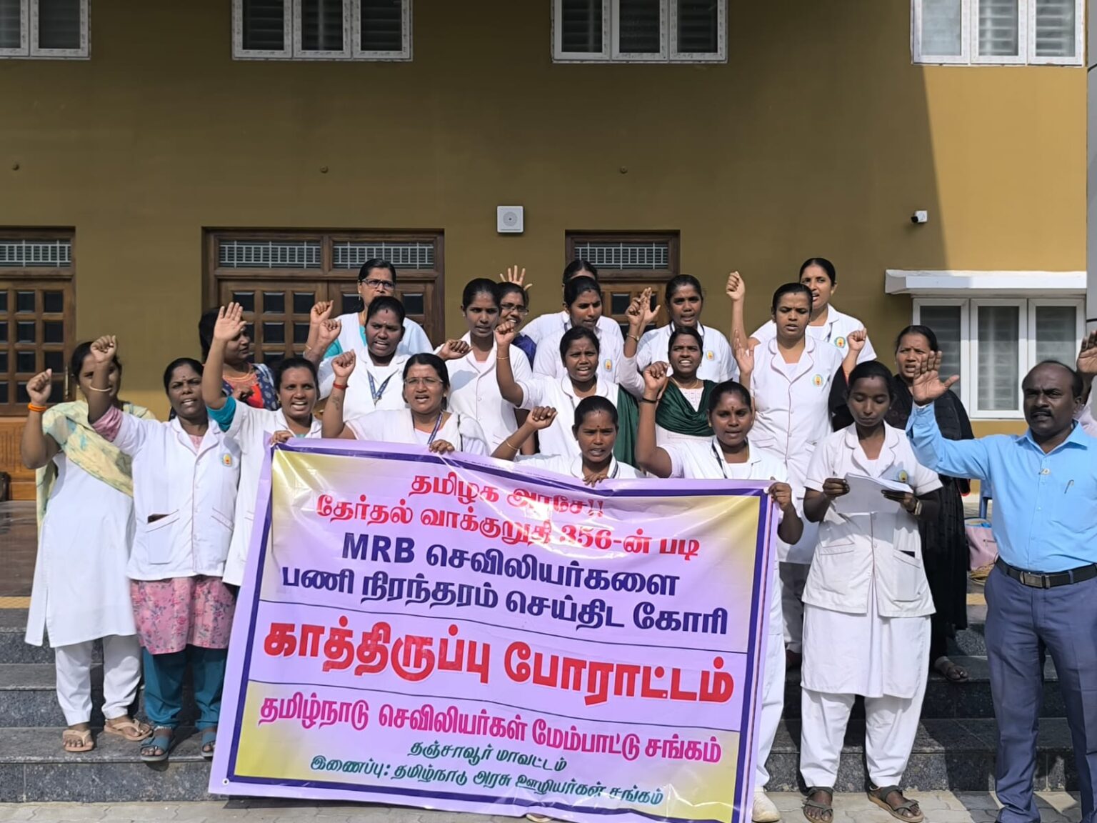 பட்டப்படிப்பு மற்றும் பட்ட மேற்படிப்பு முடித்த செவிலியர்களுக்கு ஊதிய உயர்வு வழங்க வேண்டும். எம் ஆர் பி தொகுப்பு ஊதிய செவிலியர்களுக்கு ஊதியத்துடன் கூடிய மகப்பேறு விடுப்பு வழங்க வேண்டும் கோரிக்கை முன்வைத்து தஞ்சை மருத்துவக் கல்லூரி மருத்துவமனை வளாகத்தில் தொடர்ந்து நான்கு நாட்களாக போராட்டம் நடத்தி வரும் செவிலியர்கள் என்று கோரிக்கை பேட்ச் அணிந்து ஆர்ப்பாட்டத்தில் ஈடுபட்டனர். இப்போது முதல்வருக்கு கண்ணீர் மல்க கோரிக்கை வைத்தனர்.