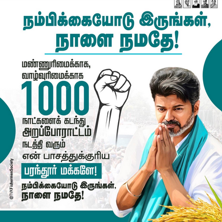 இதுகுறித்து விஜய் தனது எக்ஸ் பக்கத்தில், “நிலம் மற்றும் வாழ்வுரிமைக்காக ஆயிரம் நாட்களுக்கு மேலாக அறவழிப் போராட்டம் நடத்தி வரும் பரந்தூர் மக்களே நம்பிக்கையோடு இருங்கள் நாளை நமதே!” என்று பதிவிட்டுள்ளார். முன்னதாக, ஜனவரி 20-ம் தேதி, தவெக தலைவர் விஜய், பரந்தூர் விமான நிலையத்துக்கு எதிராகப் போராடும் போராட்டக் குழுக்களையும், கிராம மக்களையும் நேரில் சந்தித்து ஆதரவு தெரிவித்தது நினைவுகூரத்தக்கது.