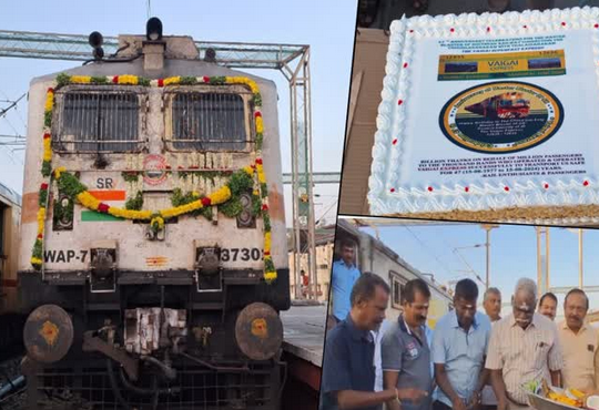 ரயில் நேற்று தனது 48-வது பிறந்தநாளைக் கொண்டாடியது. இந்த சந்தர்ப்பத்தில், ரயில் பயணிகளும் ஆர்வலர்களும் காலை 6 மணிக்கு முதல் நடைமேடையில் வைகை ரயில் எஞ்சின் முன் கேக் வெட்டி கொண்டாடினர்.