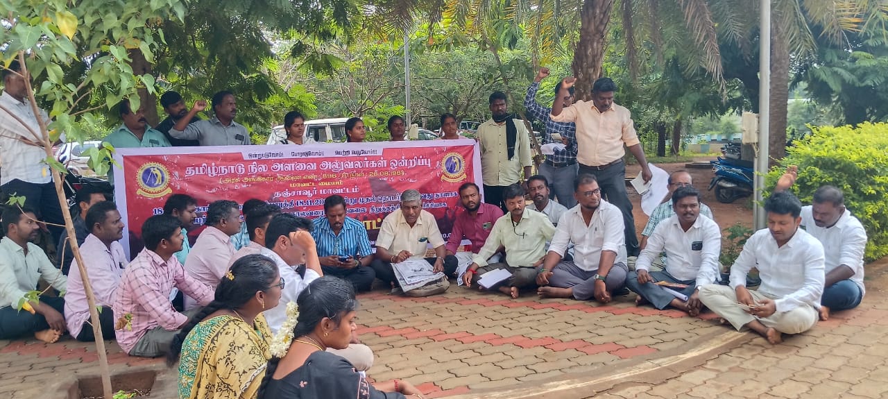 தஞ்சை மாவட்ட ஆட்சியர் அலுவலகம் முன்பு தமிழ்நாடு நில அளவை அலுவலர்கள் ஒன்றிப்பு சார்பில், மாவட்டத் தலைவர் டேனியல் மார்க்ஸ் தலைமையில் மனித சக்திக்கு மீறிய பணிகளை ரத்து செய்ய வேண்டும்,ஆய்வாளருக்கும் துணை ஆய்வாளருக்கும் இடையிலான ஊதிய முரண்பாடுகளை களைய வேண்டும்.